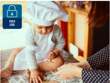Child Lock Cuptorul cu microunde este prevazut cu o functie speciala de siguranta pentru copii, ce permite panoului de comanda sa fie „blocat”, astfel incat copiii sa nu il poata folosi accidental. Garanteaza siguranta absoluta in bucataria ta! | ![]() |