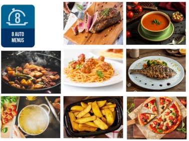 8 Auto menus Cand obisnuiti sa gatiti mancaruri zi de zi si este incomod sa efectuati mereu aceleasi setari, va va fi de mare folos un cuptor cu microunde care sa va ofere meniuri prestabilite alese cu grija pentru confortul dvs. Tot ce aveti de facut este sa alegeti ce doriti: Auto Reincalzire, Legume, Peste, Carne, Paste, Cartofi, Pizza sau Supa. | ![]() |